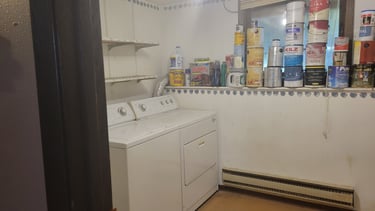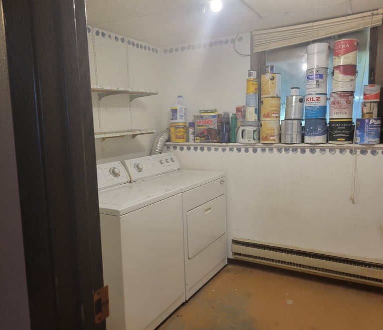 Laundry Room: sump pump, Washer/dryer 200 amp breaker boxBathroom: 5’ X 9’6” -tub/shower, Vanity, stool, vinyl plankBedroom: 12’9” X 10’2” – Carpet, paint, double closetBedroom: 9’5” X 11’7” – Carpet, paint, double closetLarge storage closet